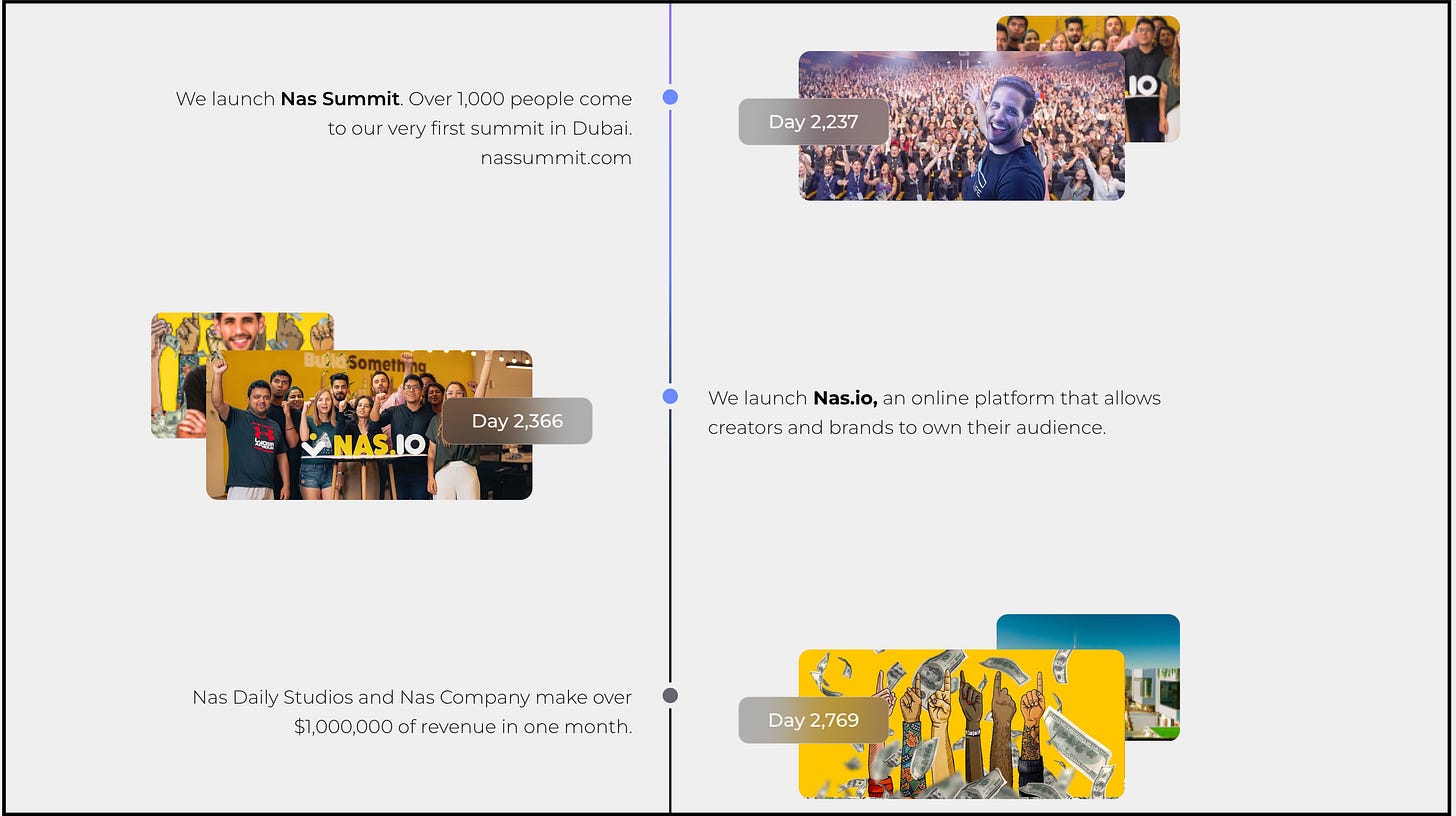 When Nuseir Yassin started Nas Daily, he was a solo travel vlogger making one-minute Facebook videos each day. Fast forward, and Nas Daily has evolved into Nas Company, a global media and education business. Nuseir treated his explosive social media growth as the foundation for something bigger: he began hiring a team to help film and edit content, opened offices in Singapore and Dubai, and started thinking beyond just videos. He launched Nas Academy, an online platform for creator courses, and Nas.io, a community-building SaaS product for creators and brands. This startup-style approach attracted serious investor attention - Nas Company raised $25 million in funding to expand its creator education and community platforms. The company rapidly scaled; at one point, Nas’s ventures pulled in over $1,000,000 of revenue in a single month.