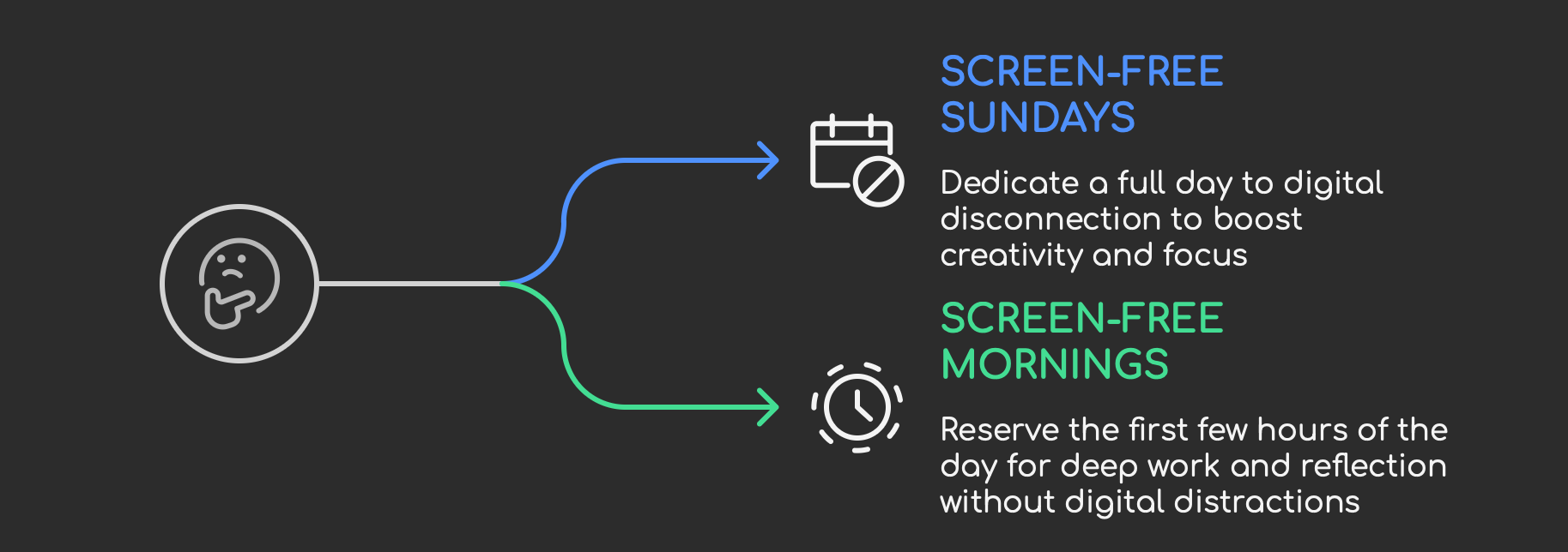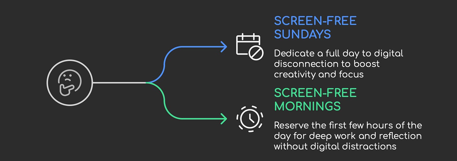 You don’t need to disappear for weeks to reap the benefits of logging off. Start small, stay intentional, and build a rhythm that supports your creativity and mental clarity. Here’s a simple plan to get started 👇🏻